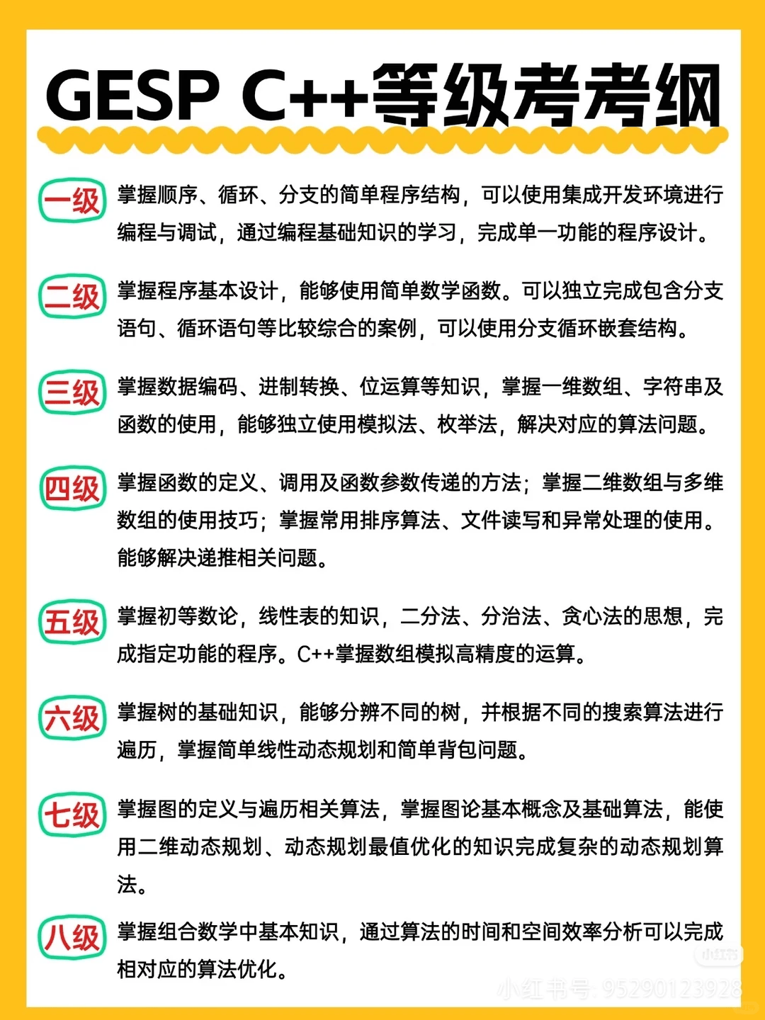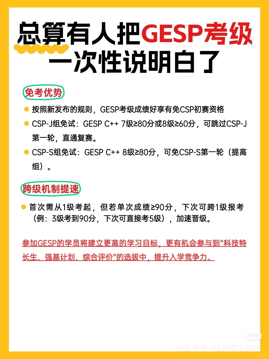 划重点!GESP 最高两级考纲和 CSP-J/S 高度匹配,无缝衔接信奥赛核心考点!娃只要通过对应级别,还能直接拿下 CSP-J/S 第一轮免试资格,少走备考弯路,竞赛进阶快人一步!