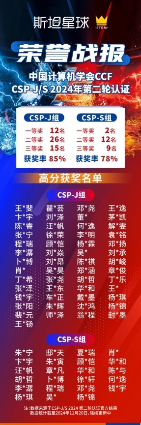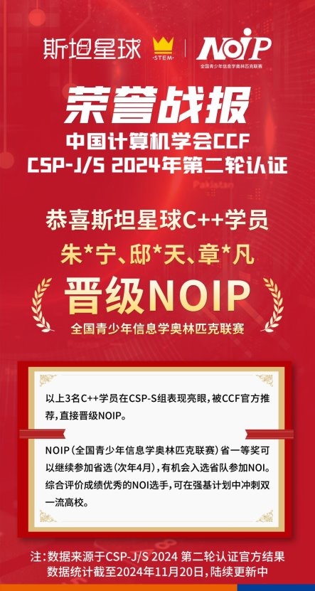 近日,NOI 官网公布了 CCF CSP-J/S 2024 第二轮认证评级的分数线和获奖情况,斯坦星球众多 C++ 学员在此次复赛中表现出色,取得了令人瞩目的成绩。