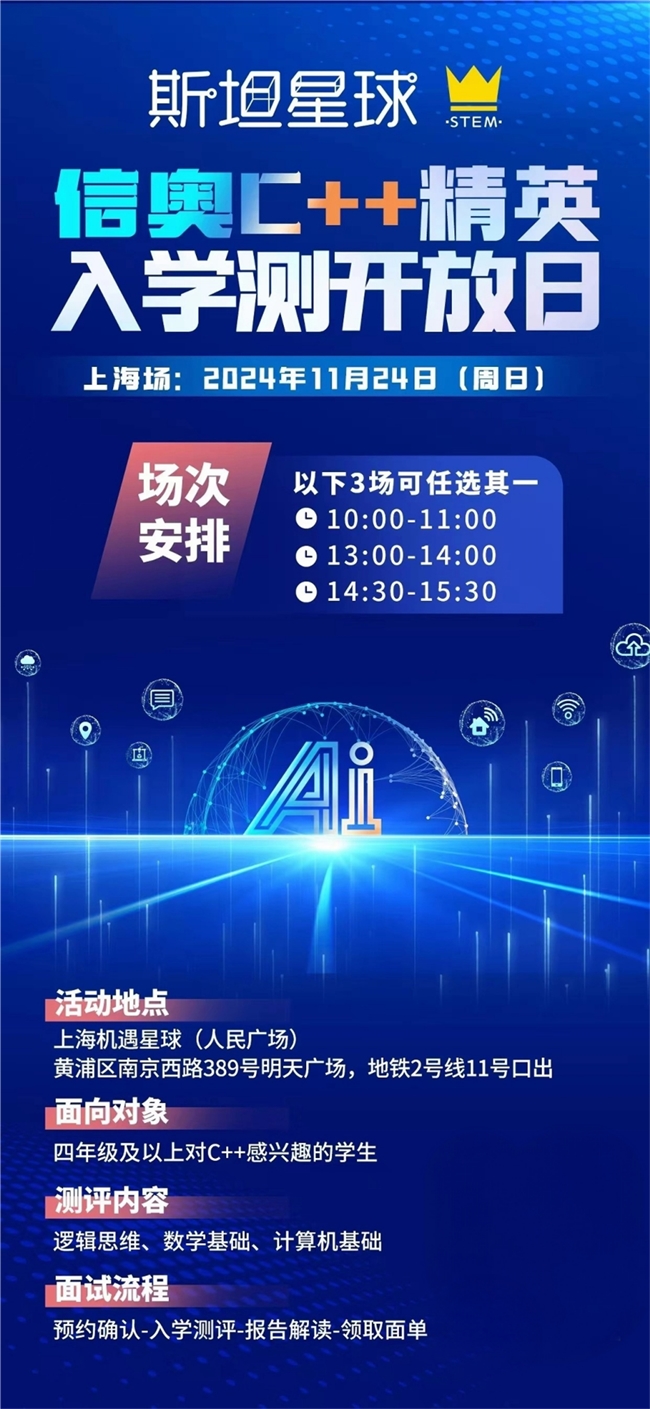 斯坦星球为帮助更多学生了解信息学奥林匹克竞赛,将于 2024 年 11 月 24 日在上海机遇星球(人民广场)举办【信奥 C++ 精英入学测开放日】活动(上海站),面向四年级及以上对 C++ 感兴趣的学生,测评内容包括逻辑思维、数学基础、计算机基础,通过预约确认、入学测评、报告解读、领取面单等流程,为孩子提供科学合理的起点。
