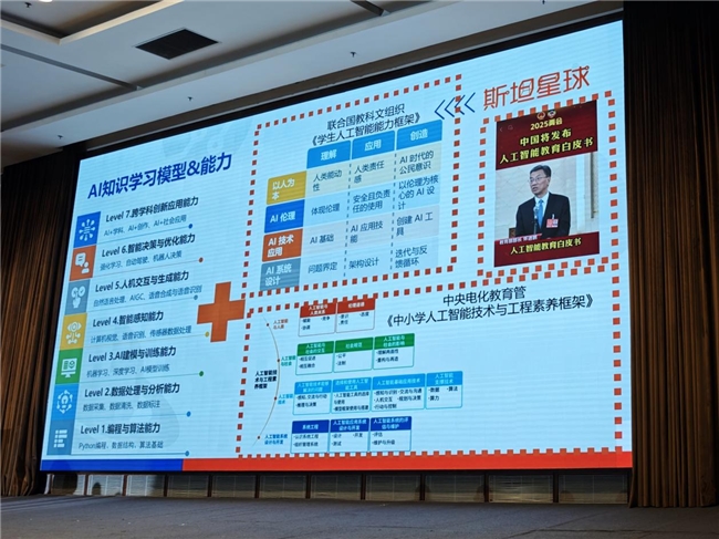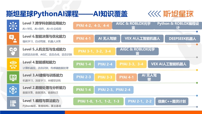 发布会上,斯坦星球课程研发老师Tony提到,斯坦星球的AI课程设计,是基于AI知识学习模型与能力的七个层次,从编程与算法能力到跨学科创新应用能力,全面覆盖AI学习的各个阶段。