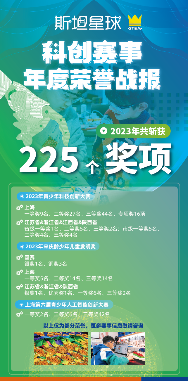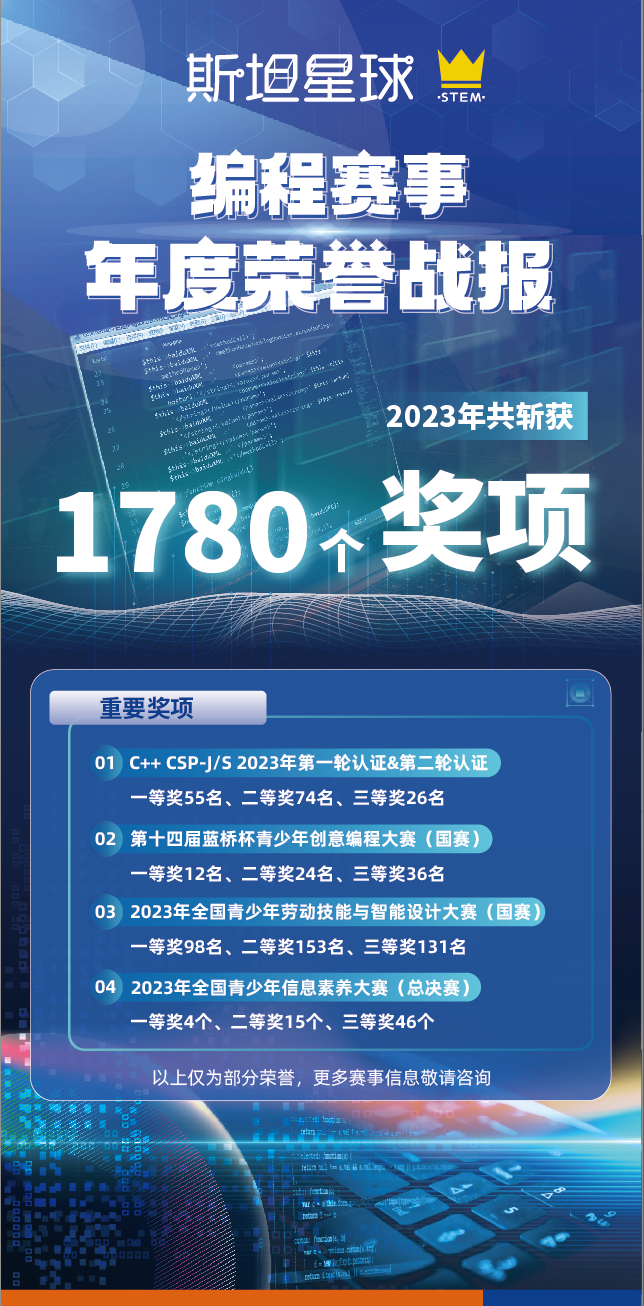 仅2023年小斯坦星人就斩获了3500+个重磅奖项,这样优异的成绩不仅是对学员实力的肯定,也是对斯坦星球教学质量的证明!