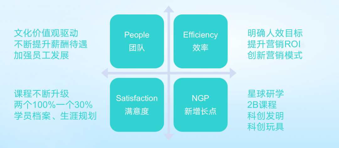第一是强调“内循环”。教育行业已经改变,不能再把主要精力放在外循环上,而应更加注重内循环。从整个的资源投放上来讲,要逐渐加大投放在内部的比例,通过提升服务来提升客户满意度,最终提升 LTV 和口碑推荐。