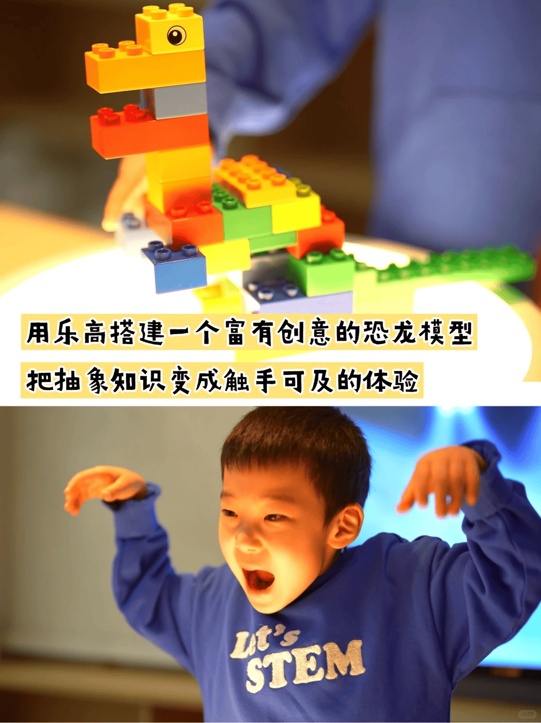 乐高恐龙创意搭建!没有标准答案,没有思路限制!娃可以尽情发挥脑洞,拼搭带翅膀的霸王龙、会发光的三角龙…… 还能和小伙伴分享设计巧思,动手能力 + 创造力双双在线!