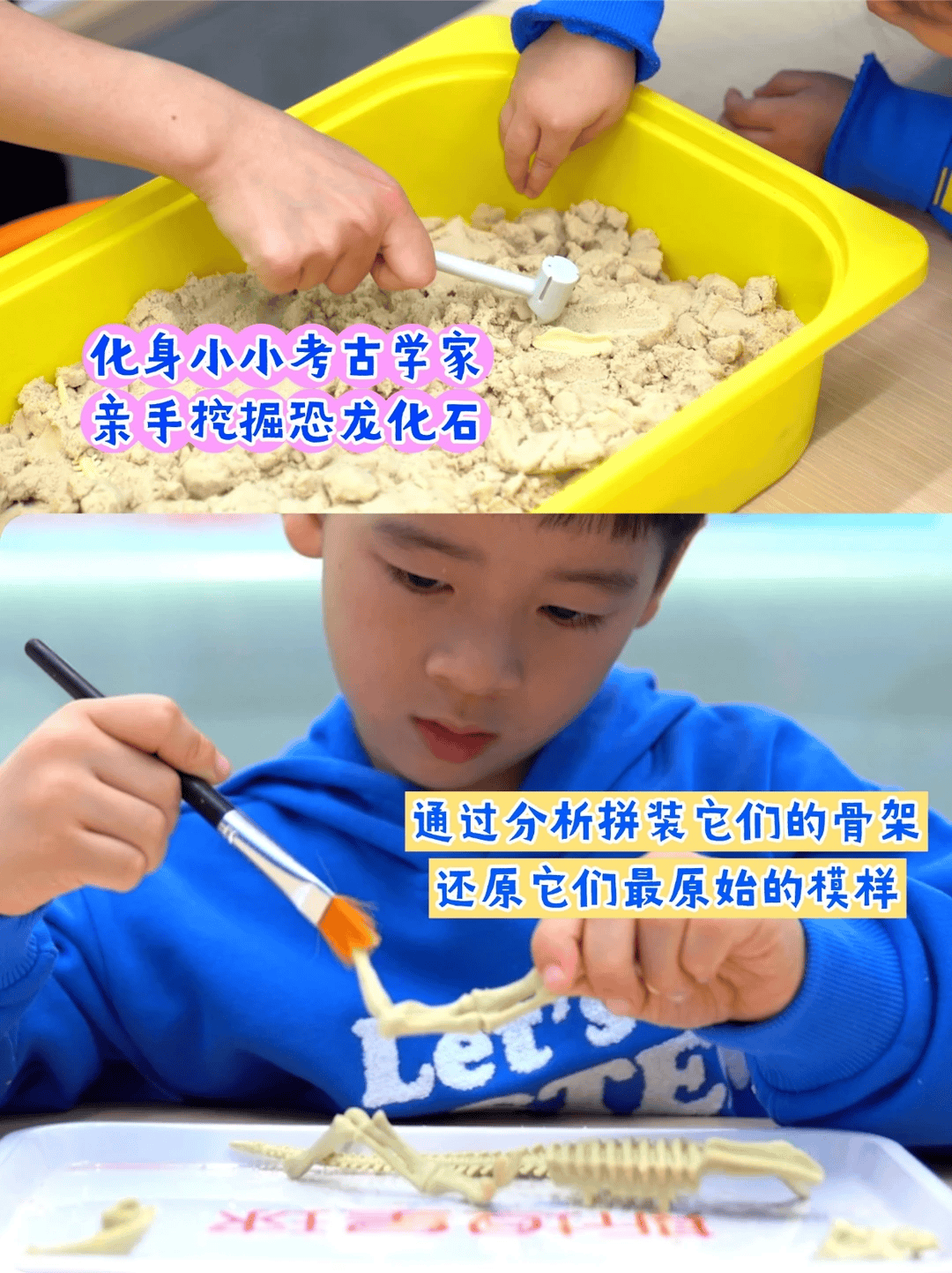变身小小考古学家!戴上专属小手套、拿起迷你小刷子,小心翼翼挖掘恐龙化石的样子超专注~挖出碎片后亲手拼搭恐龙骨架,完成的瞬间成就感拉满!